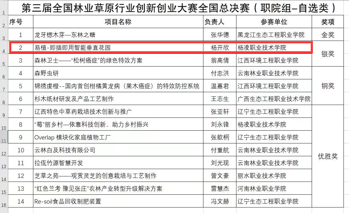 总决赛以线上路演答辩的方式进行,学校生态与环境工程分院“易植—即插即用智能垂直花园”项目荣获总决赛职院组-自选类银奖。生物工程学院“莓丽乡村—依靠科技创新、助力乡村振兴”项目荣获优胜奖。学校荣获全国半决赛中国(北方)现代林业职业教育集团赛点“优秀组织奖”。