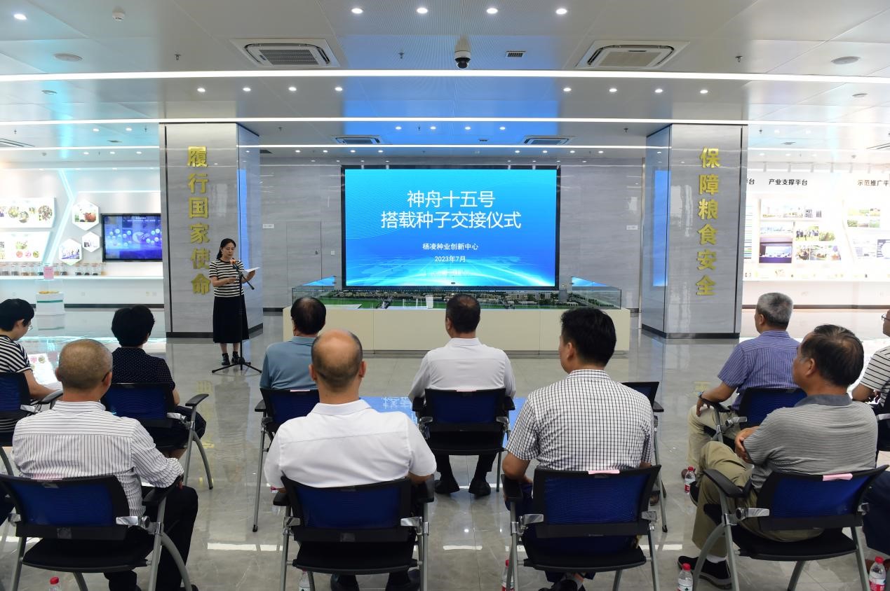 ▲7月 28 日,神舟十五号搭载种子交接仪式在杨凌国际种业大厦举行。交接仪式上,杨凌示范区党工委委员、管委会副主任马江涛向我校副校长祝战斌移交了由学校培育的在太空遨游了186天的小麦育种材料“武农981”“杨职99”和“杨职111”,并颁发公证证书。