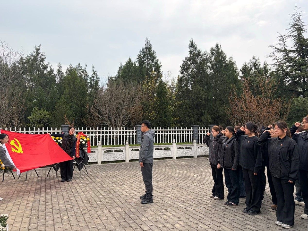 在重温入党誓词环节,全体党员面对党旗,高举右拳,庄严宣誓,铿锵誓言在陵园上空回荡,彰显了青年党员不忘初心、牢记使命的坚定信念。随后,全体学生在领誓人带领下,面向烈士纪念碑集体宣誓:“铭记历史,感恩奋进;学好专业,报效祖国;强国有我,请党放心!”字字铿锵,句句有力,表达了新时代青年奋发有为、报效祖国的坚定决心。在祭奠瞻仰环节,全体师生缓步绕行烈士纪念碑,俯身擦拭墓碑,敬献鲜花,表达对英烈的崇高敬意和无限追思。活动最后,全体人员在纪念碑前合影留念。