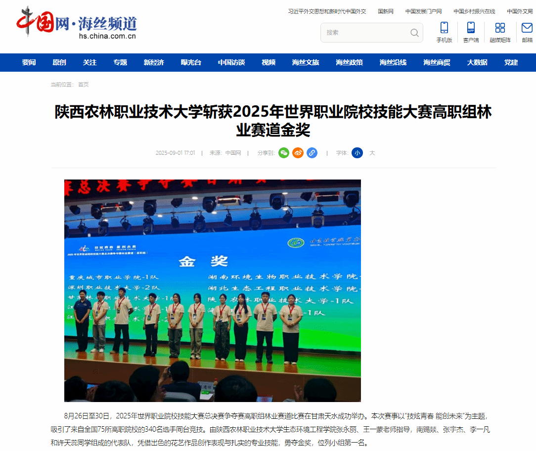 8月26日至30日,2025年世界职业院校技能大赛总决赛争夺赛高职组林业赛道比赛在甘肃天水成功举办。本次赛事以“技炫青春 能创未来”为主题,吸引了来自全国75所高职院校的340名选手同台竞技。由best365足球官网生态环境工程学院张永丽、王一蒙老师指导,南赐燚、张宇杰、李一凡和许天蕊同学组成的代表队,凭借出色的花艺作品创作表现与扎实的专业技能,勇夺金奖,位列小组第一名。