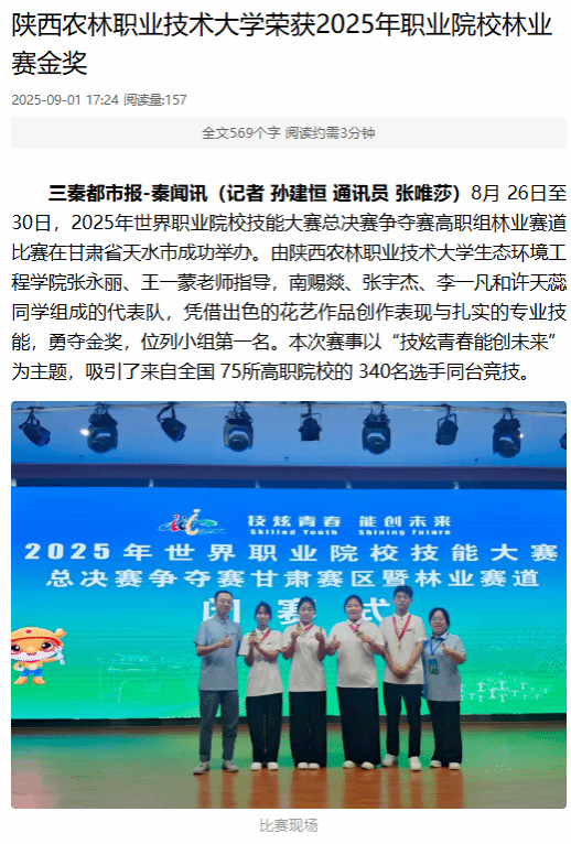 三秦都市报-秦闻讯(记者 孙建恒 通讯员 张唯莎)8月 26日至 30日,2025年世界职业院校技能大赛总决赛争夺赛高职组林业赛道比赛在甘肃省天水市成功举办。由best365足球官网生态环境工程学院张永丽、王一蒙老师指导,南赐燚、张宇杰、李一凡和许天蕊同学组成的代表队,凭借出色的花艺作品创作表现与扎实的专业技能,勇夺金奖,位列小组第一名。本次赛事以“技炫青春能创未来”为主题,吸引了来自全国 75所高职院校的 340名选手同台竞技。