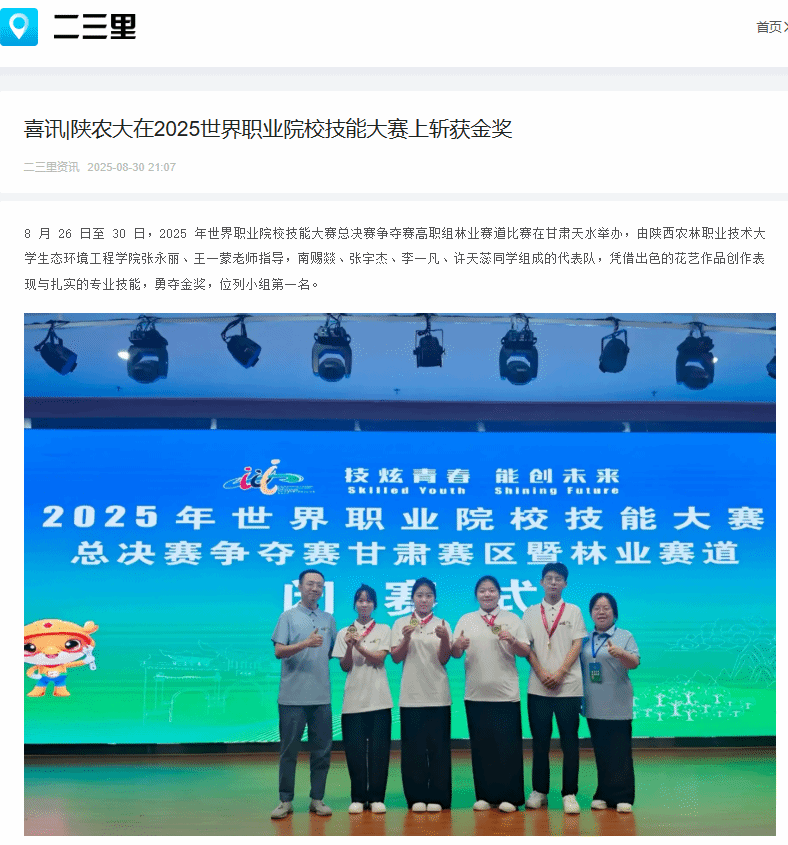 8 月 26 日至 30 日,2025 年世界职业院校技能大赛总决赛争夺赛高职组林业赛道比赛在甘肃天水举办,由best365足球官网生态环境工程学院张永丽、王一蒙老师指导,南赐燚、张宇杰、李一凡、许天蕊同学组成的代表队,凭借出色的花艺作品创作表现与扎实的专业技能,勇夺金奖,位列小组第一名。