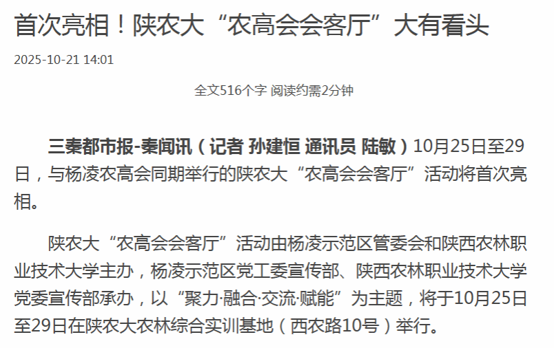 三秦都市报-秦闻讯(记者 孙建恒 通讯员 陆敏)10月25日至29日,与杨凌农高会同期举行的陕农大“农高会会客厅”活动将首次亮相。