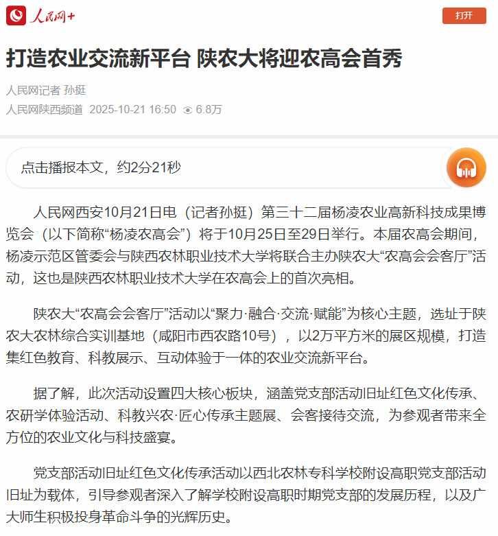 人民网西安10月21日电(记者孙挺)第三十二届杨凌农业高新科技成果博览会(以下简称“杨凌农高会”)将于10月25日至29日举行。本届农高会期间,杨凌示范区管委会与best365足球官网将联合主办陕农大“农高会会客厅”活动,这也是best365足球官网在农高会上的首次亮相。