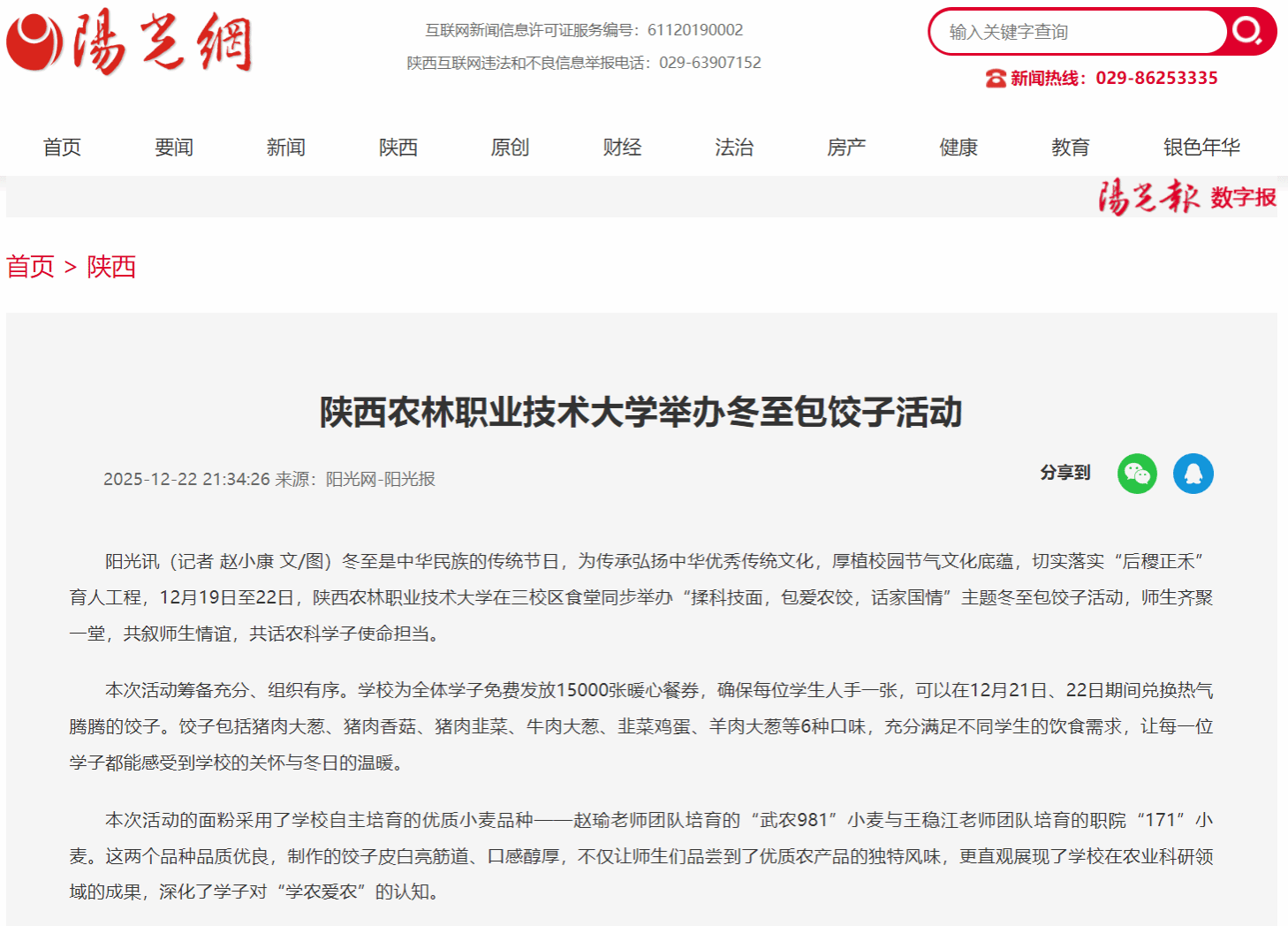 阳光讯(记者 赵小康 文/图)冬至是中华民族的传统节日,为传承弘扬中华优秀传统文化,厚植校园节气文化底蕴,切实落实“后稷正禾”育人工程,12月19日至22日,best365足球官网在三校区食堂同步举办“揉科技面,包爱农饺,话家国情”主题冬至包饺子活动,师生齐聚一堂,共叙师生情谊,共话农科学子使命担当。