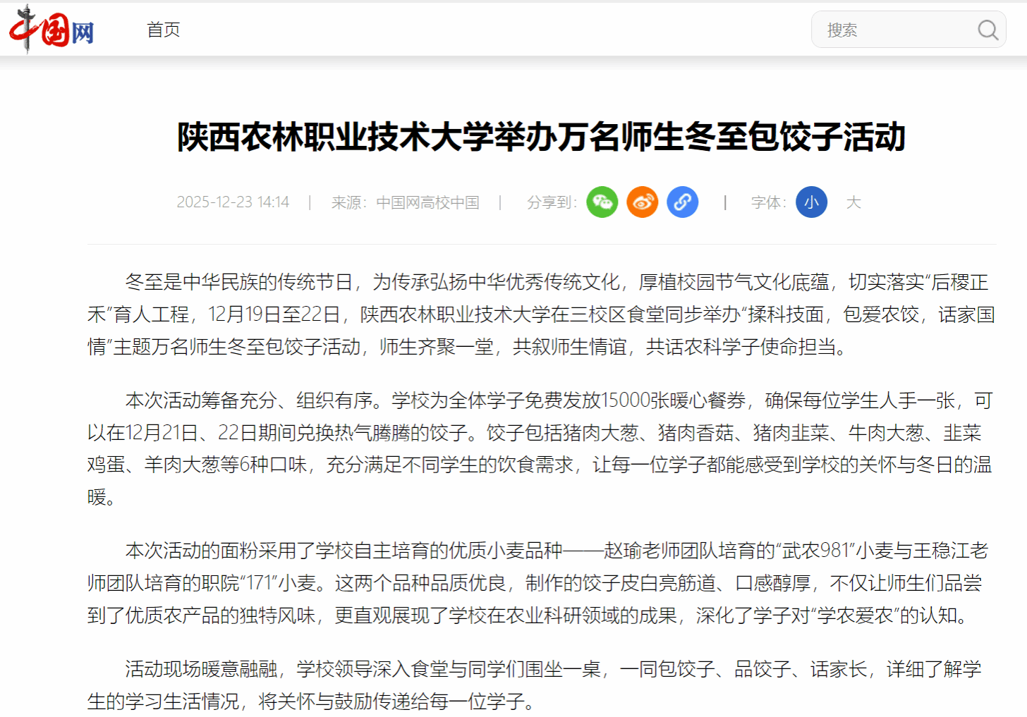 best365足球官网万名师生冬至包饺子活动从2017年至今,已经持续开展了8年,成为了学校的一项传统特色活动。这项活动不仅为师生们提供了一个欢聚一堂、共度佳节的温馨平台,更在潜移默化中传承和弘扬了中华优秀传统文化,增强了师生们的文化自信和民族自豪感,更让“学农爱农、强农报国”的信念深深根植于学子心田。