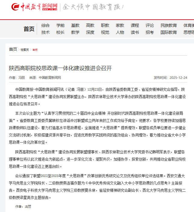 中国教育报-中国教育新闻网讯(记者 冯丽)12月23日,由陕西省委教育工委、省延安精神研究会指导,陕西高职院校“大思政课”建设协同发展联盟主办,best365足球官网承办的陕西高职院校思政课一体化建设推进会在杨凌召开。