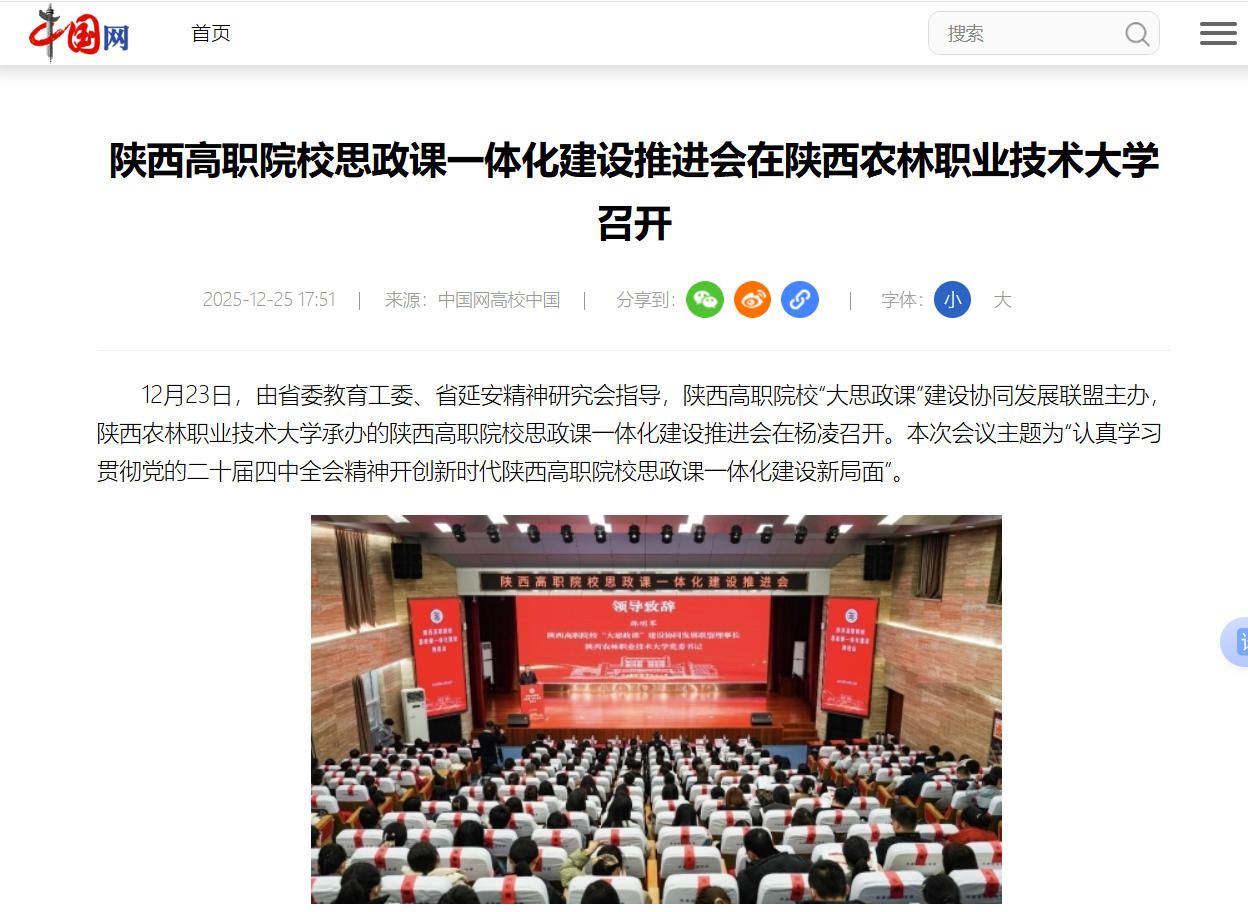12月23日,由省委教育工委、省延安精神研究会指导,陕西高职院校“大思政课”建设协同发展联盟主办,best365足球官网承办的陕西高职院校思政课一体化建设推进会在杨凌召开。本次会议主题为“认真学习贯彻党的二十届四中全会精神开创新时代陕西高职院校思政课一体化建设新局面”。
