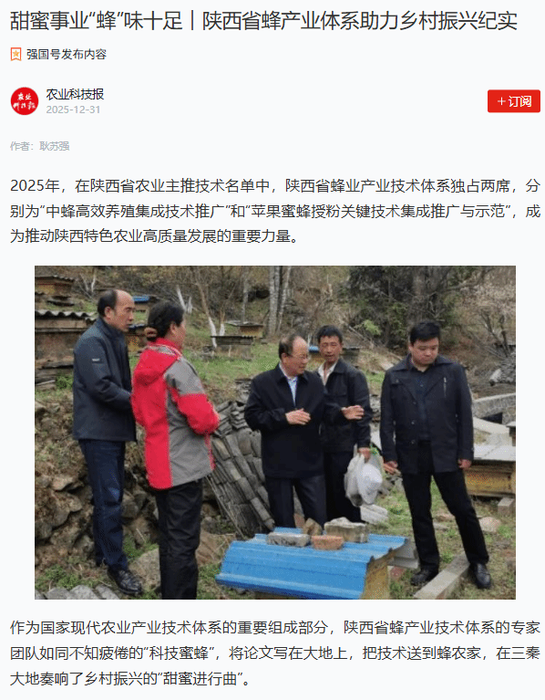 2025年,在陕西省农业主推技术名单中,陕西省蜂业产业技术体系独占两席,分别为“中蜂高效养殖集成技术推广”和“苹果蜜蜂授粉关键技术集成推广与示范”,成为推动陕西特色农业高质量发展的重要力量。