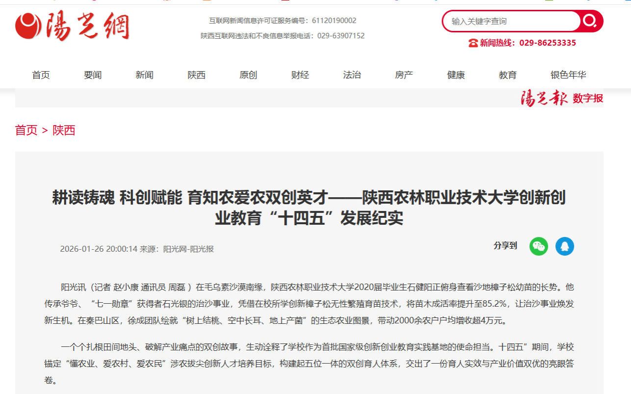 “让学生带着泥土芬芳成长,把论文写在大地上。”这是学校双创教育的核心理念。学校以“后稷正禾”育人工程为引擎,将农耕文化、红色基因融入双创教育全链条,构建“党建领航定向+农耕文化培根+红色筑梦赋能+陕农精神铸魂”的四维育人格局。依托“双创训练营+红旅实践行+技术帮扶团”立体化活动矩阵,年均开展双创品牌活动50余场,覆盖师生超2.6万人次。《抚沙为茵 点沙成金》等4个案例入选陕西省2025年“青年红色筑梦之旅”典型案例。“治沙精神”“赵瑜精神”已成为学校思创融合的精神坐标,引领师生在服务“三农”中锤炼过硬本领。