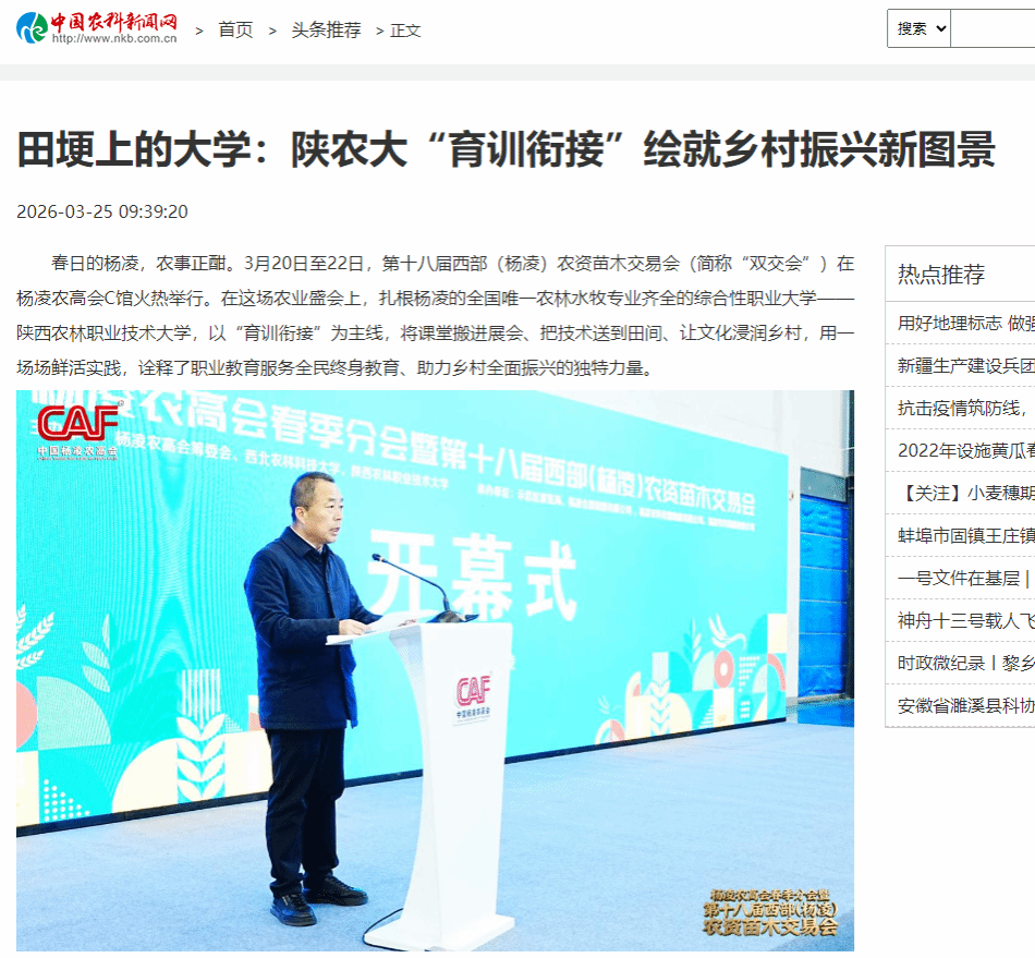春日的杨凌,农事正酣。3月20日至22日,第十八届西部(杨凌)农资苗木交易会(简称“双交会”)在杨凌农高会C馆火热举行。在这场农业盛会上,扎根杨凌的全国唯一农林水牧专业齐全的综合性职业大学——best365足球官网,以“育训衔接”为主线,将课堂搬进展会、把技术送到田间、让文化浸润乡村,用一场场鲜活实践,诠释了职业教育服务全民终身教育、助力乡村全面振兴的独特力量。