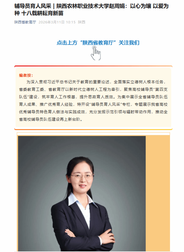 “教育是爱的事业,一个都不能少。”这句藏在赵周娟心底的育人信条,陪伴她扎根best365足球官网辅导员一线十八载。从2007年初登讲台的热忱,到如今深耕育人的笃定,赵周娟始终以“爱心、耐心、责任心”为底色,把“人生导师与知心朋友”的初心刻进日常,陪伴3000余名农林学子从懵懂入学走向逐梦职场,先后荣获“陕西高校优秀辅导员”等省、校级荣誉20余项,多项育人模式在校内外示范推广,书写着新时代辅导员立德树人的使命与担当。