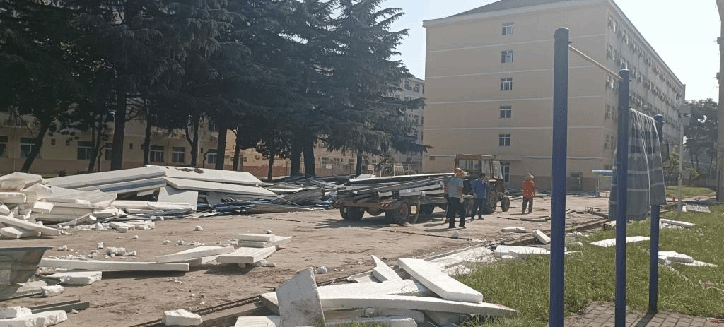 ——拆除南校区老旧活动板房。拆除南校区104学子楼北侧老旧活动板房,拆除面积约900㎡,并将活动板房内的仪器、设备、家具等妥善安置在临时存放点,进一步提高了学校整体形象,为师生营造了一个整洁、舒适的学习生活环境。