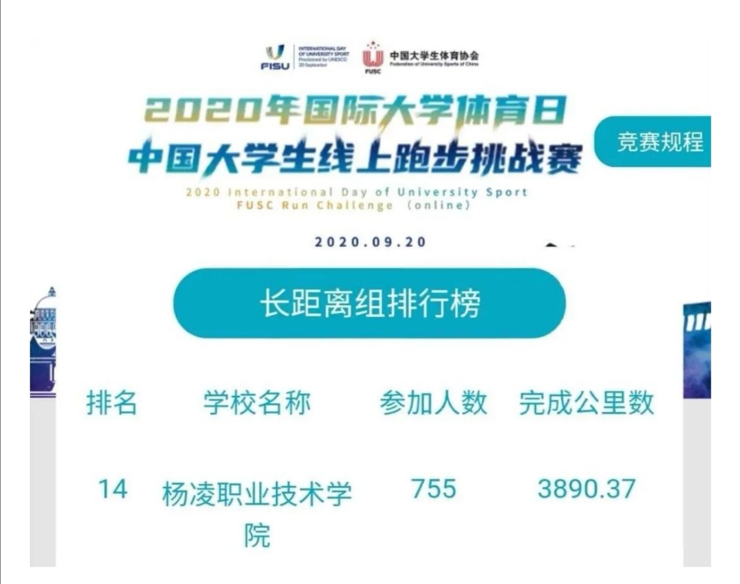 9月18日到20日中国大学生体育协会发起“2020年国际大学体育日·中国大学生线上跑步挑战赛”,我院在比赛中获得全国第十四名, 陕西高校排名第一,全国高职院校中排名第三