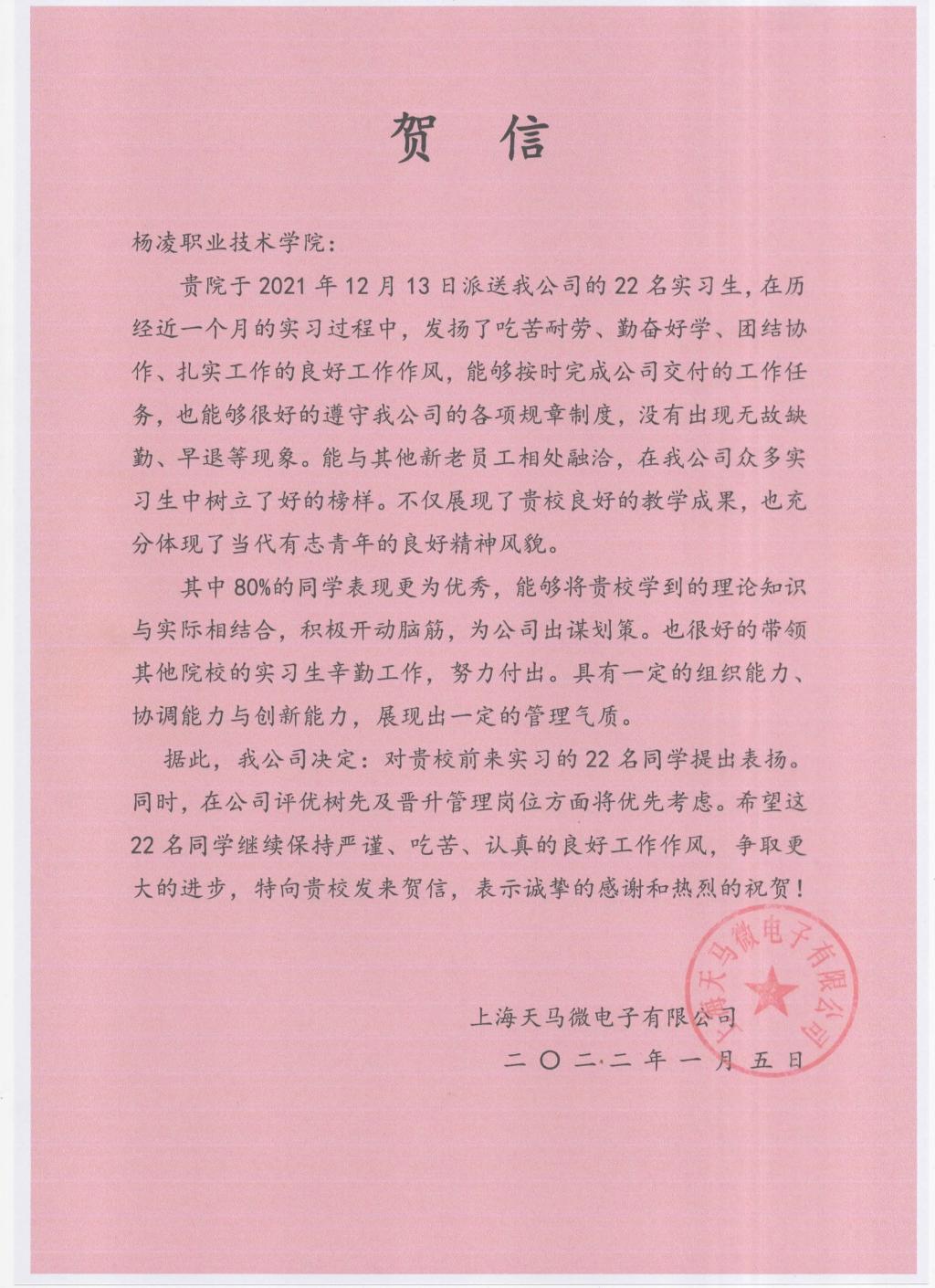 1月5日,上海天马微电子有限公司发来贺信,对我校机电工程学院和信息工程学院的22名实习生提出表扬。