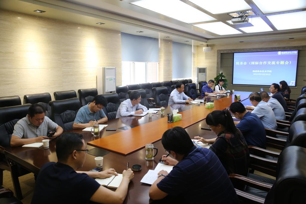 会上,国际合作交流处处长杜斌围绕国际合作交流制度建立、海外分校建设、参与上合组织农业技术交流培训示范基地建设、国际课程合作、国际学生培养、拓展多元化合作渠道等六方面,对近年来学校国际合作交流工作作了全面汇报。随后,校领导及与会部门、二级学院相关负责人就深入推进学校国际化办学进程进行了交流发言。