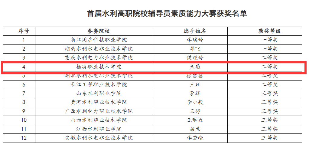 6月25至26日,由中国水利教育协会主办,浙江同济科技职业学院承办的首届水利高职院校辅导员素质能力大赛顺利举办,我校辅导员朱燕以总位次第4的成绩获得二等奖。