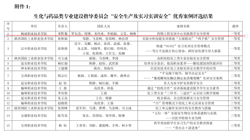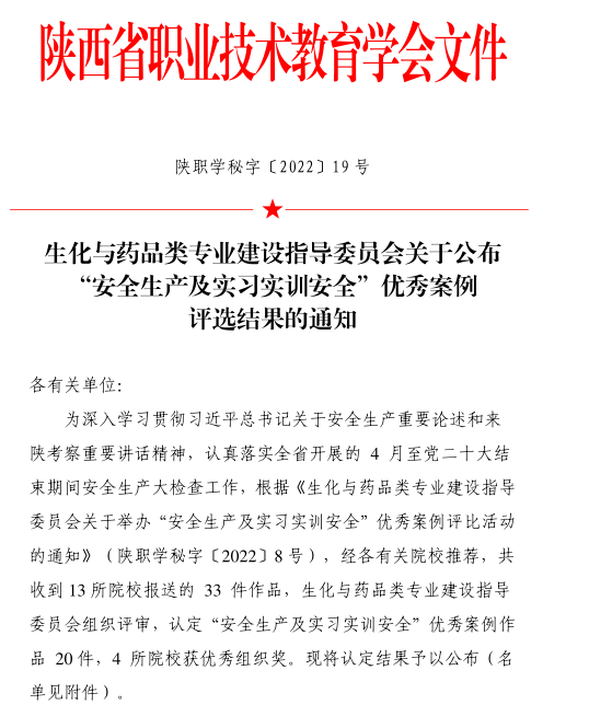 近日,陕西省职业技术教育学会生化与药品类专业建设指导委员会公布了“安全生产及实习实训安全”优秀案例评选结果。我校药物与化工学院实践教学安全管理案例获一等奖。