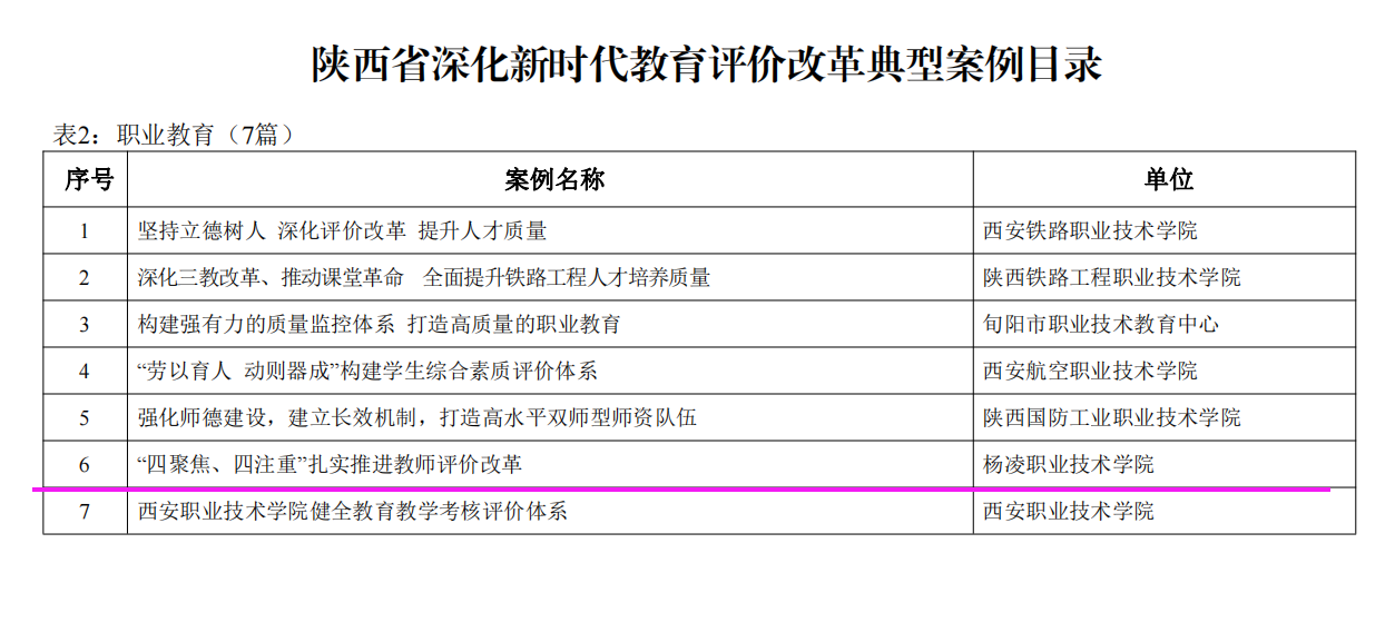 近日,省委教育工作领导小组公布了陕西省深化新时代教育评价改革典型案例名单,我校《“四聚焦、四注重”扎实推进教师评价改革》案例成功入选,全省共有7个案例入选职业教育典型案例。