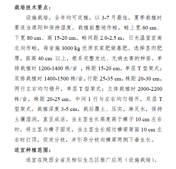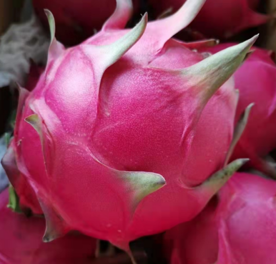 “秦红龙”火龙果新品种由杨凌职业技术学院作为第一单位,联合杨凌青皮她园火龙果种植专业合作社和杨陵区农业农村局,经过6年研究培育而成。“秦红龙”火龙果在设施条件下,2月中旬陆续开始萌芽,5月初开花。6月上旬,首批果实成熟,果期可以一直持续到12月,7月-10月为果实成熟高峰期。果实椭圆形,平均单果重563.2g,最大单果重1500g,果面光洁、色泽均匀,基本鳞片短小略退化,成熟度整果一致。6月初果皮初变软时果实含糖量24.9%,含酸量0.28%,糖酸比89.9,口感甜脆多汁。1年生扦插苗栽植,第2年开始结果,第3年进入丰产期,平均每亩产量在2800kg左右,非常适合鲜食。