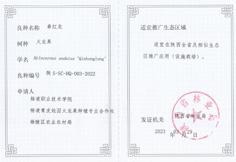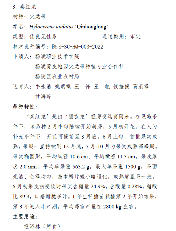 3月29日,陕西省林业局发布了2022年度陕西省林木良种名录,经陕西省林木和草品种审定委员会审定,全省共有29个品种为省级林木良种。由我校火龙果产业研发中心牛永浩博士团队选育的火龙果新品种“秦红龙”通过审定。