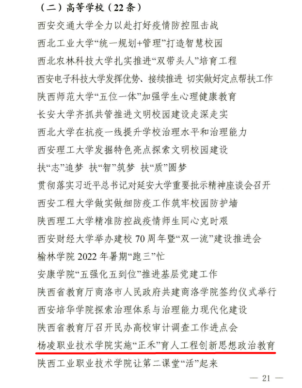 我校新闻作品《杨凌职业技术学院实施“正禾”育人工程 创新思想政治教育》,从挖掘“聚焦三教改革 搭建工程架构”“聚焦机制创新 推进多元参与”“聚焦涉农特色 加强耕读教育”“聚焦见行见效 打造品牌活动”四个方面,全面、准确地反映了我校实施“正禾”育人工程的基本情况、经验做法和取得成效,由于层次清晰、内容翔实,对兄弟院校相关工作具有重要借鉴意义而获表彰。