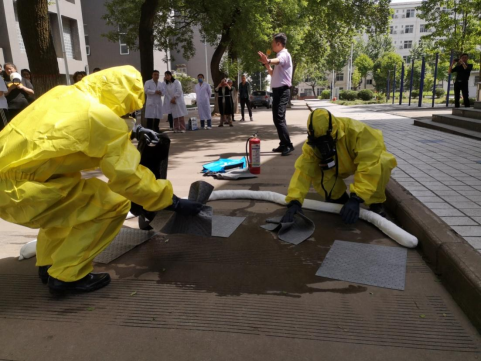 为进一步提升师生实验室应急救援、应急逃生的知识和能力,筑牢师生生命安全防线,5月12日下午,学校组织开展2023年实验室废液倾洒安全事故应急救援演练。副校长张朝晖,教务处处长刘新燕、副处长朱亮亮、资产设备处处长程斌,涉及危化品使用的五个学院全体实训指导教师和部分学生代表200余人参加应急救援演练和观摩。