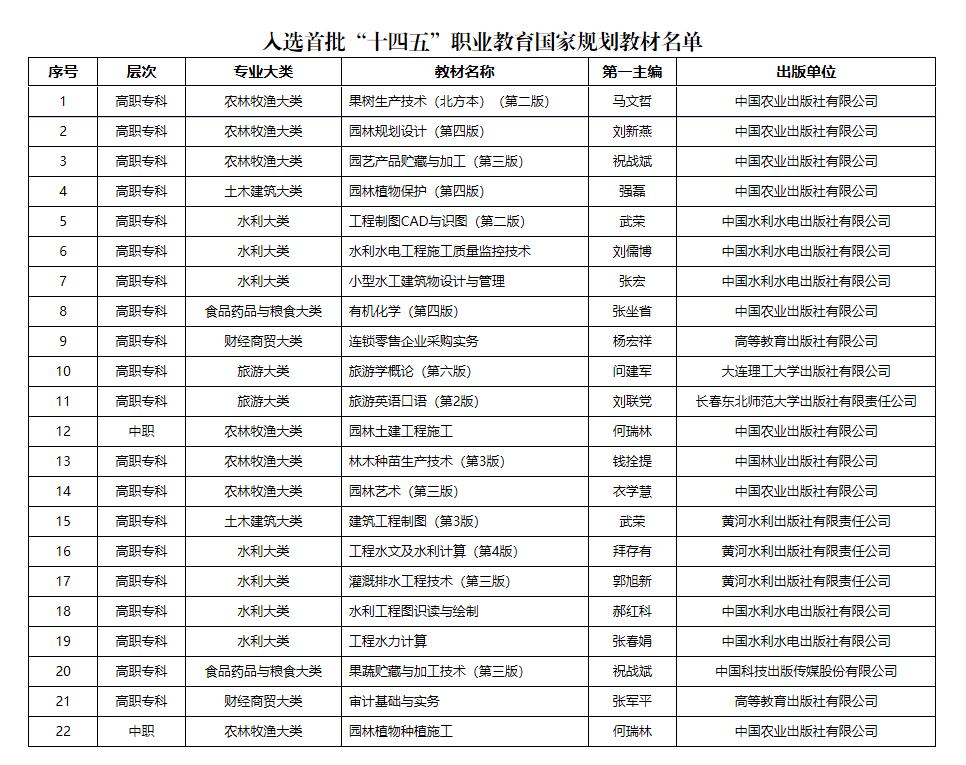 近日,教育部公布了首批“十四五”职业教育国家规划教材书目名单,我校共有22本教材成功入选其中“十三五”复核教材12本,新申报教材10本