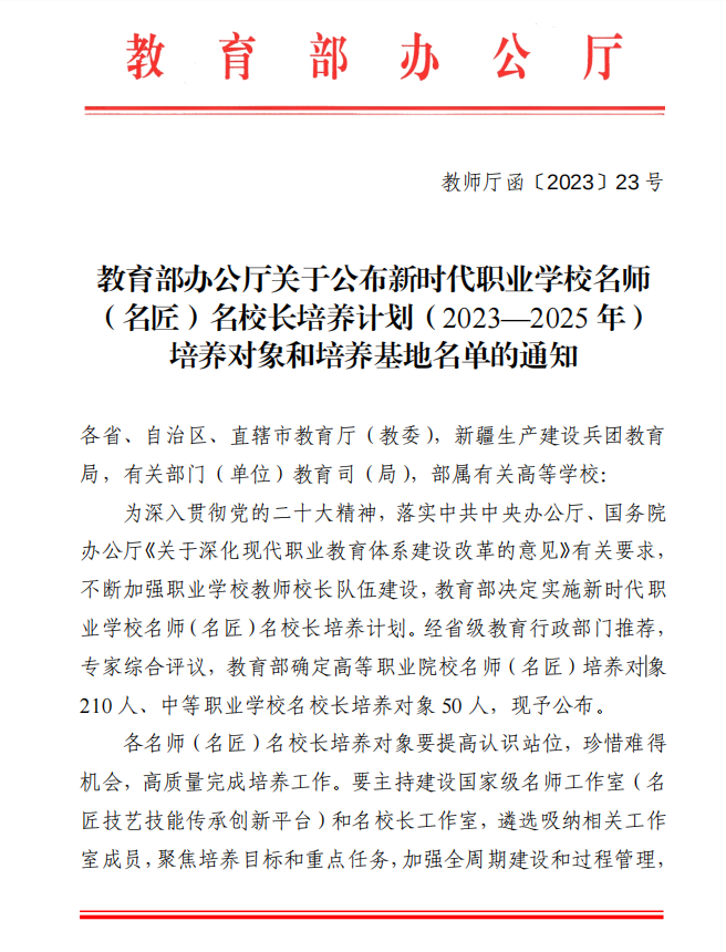 2023年7月,新时代职业学校名师(名匠)名校长培养计划正式启动。经省级教育行政部门推荐,专家综合评议,教育部确定高等职业院校名师(名匠)培养对象210 名。该计划旨在培养一批理想信念坚定、师德师风高尚、教育教学能力和专业实践能力突出的双师型名师(名匠),通过搭建国家级名师、名匠技艺技能传承创新平台,发挥名师(名匠)示范引领作用,带动职业教育教师能力素质整体提升。
