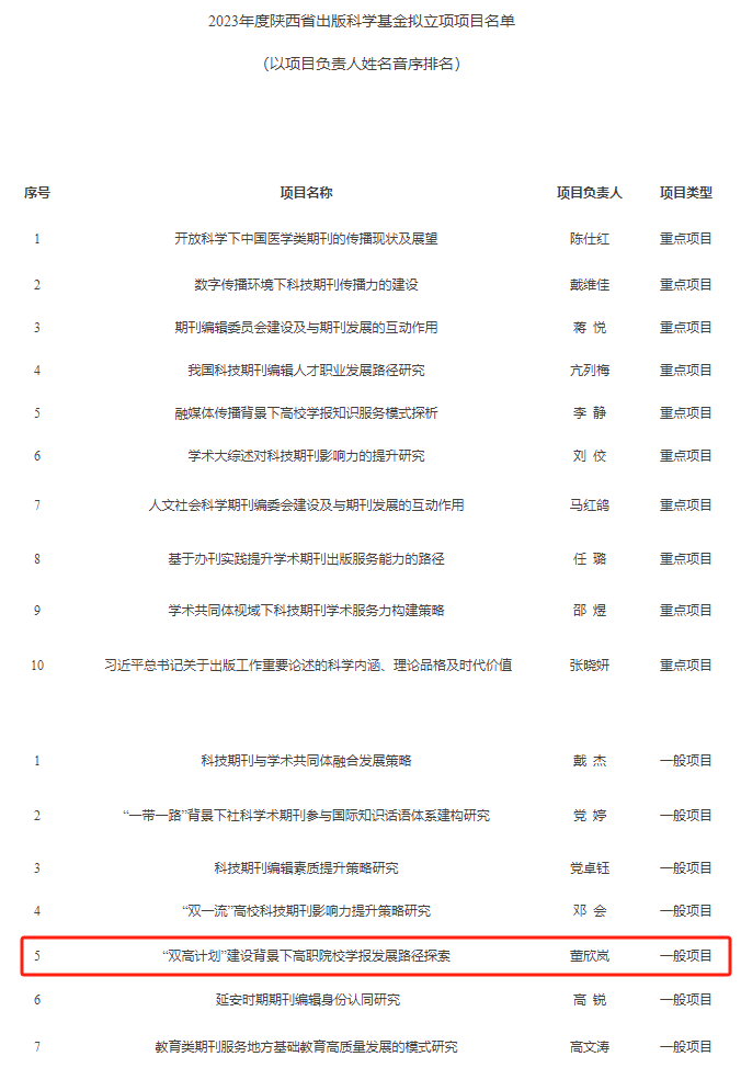 11月2日至4日,陕西省高等学校学报研究会第九届二次理事会议暨2023年学术年会在陕西韩城举行。会议公布了陕西省出版科学基金项目立项结果,我校董欣岚老师主持申报的“‘双高计划’建设背景下高职院校学报发展路径探索”课题获批立项。
