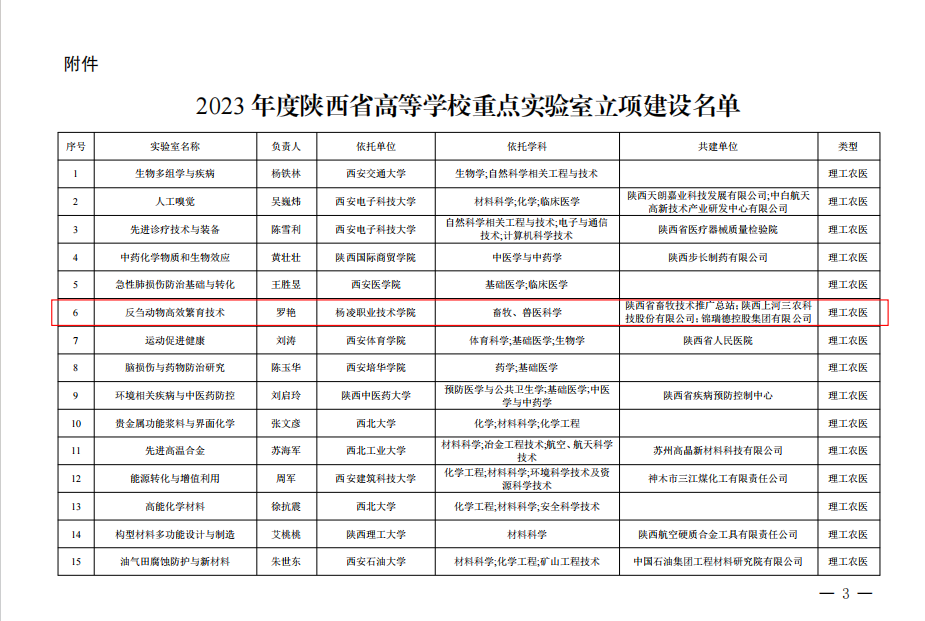 近日,陕西省教育厅公布了2023年陕西省高等学校重点实验室立项名单,我校动物工程学院罗艳团队申报的“反刍动物高效繁育技术陕西省高等学校重点实验室”成功获批。