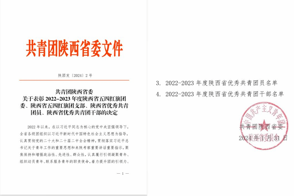 1月31日,共青团陕西省委发布了陕西省2022-2023年度“两红两优”表彰决定,学校团委荣获陕西省五四红旗团委荣誉称号。