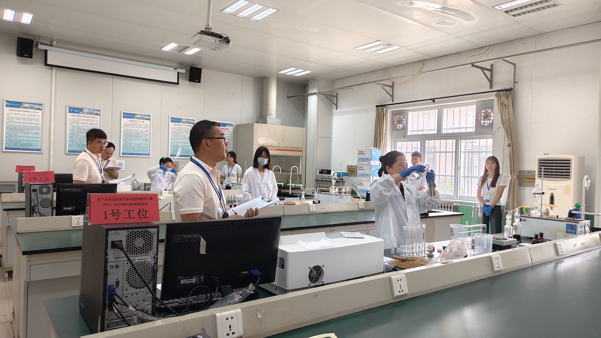 竞赛中,所有选手沉着冷静、稳定发挥,展示了扎实的理论功底和娴熟的操作技能,体现了过硬的专业素养和良好的精神风貌。对标全国竞赛要求,紧密联系全省粮食行业工作实际,设置粮油仓储管理员和农产品食品检验员两个职业工种,包括理论知识和技能操作竞赛两部分。理论知识竞赛主要检验选手们关于国家职业标准和实际工作中需要掌握的新知识、新技术、新设备和新技能。技能操作重点检验选手们佩戴正压式空气呼吸器检查气调储粮杀虫效果、计算机粮情检测与分析、储粮通风机参数测定及风机配置合理性评价等操作,以及粮食验质定等、标准溶液配制与标定等操作技能。