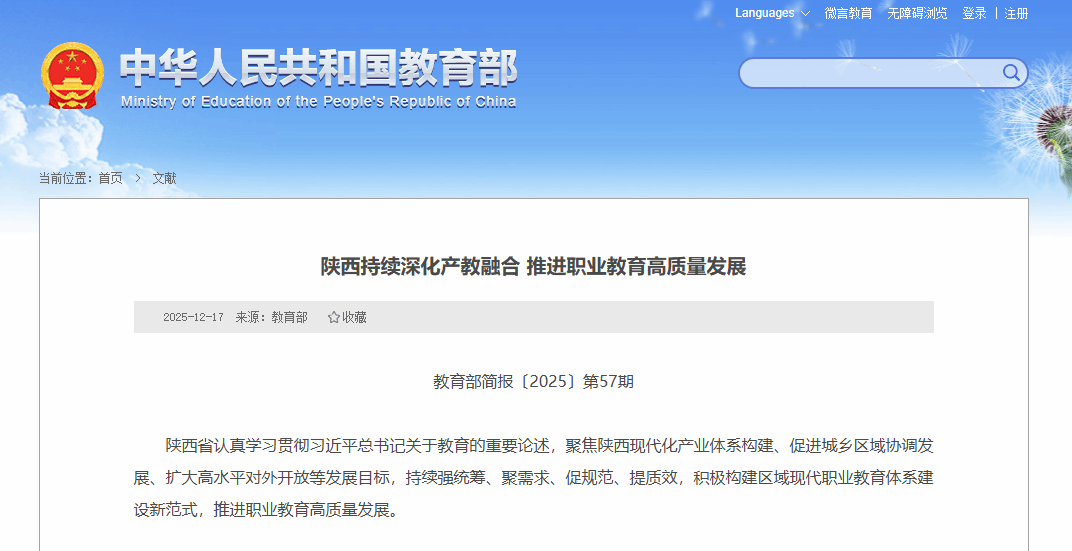 近日,教育部简报〔2025〕第57期以《陕西持续深化产教融合 推进职业教育高质量发展》为题,专题报道陕西省职业教育改革发展成效,我校作为陕西职业教育的重要力量,在科技成果转化、服务乡村振兴、深化国际交流等方面的工作举措与突出成果被重点提及,充分彰显了学校服务区域发展、赋能产业升级的责任担当与办学实力。