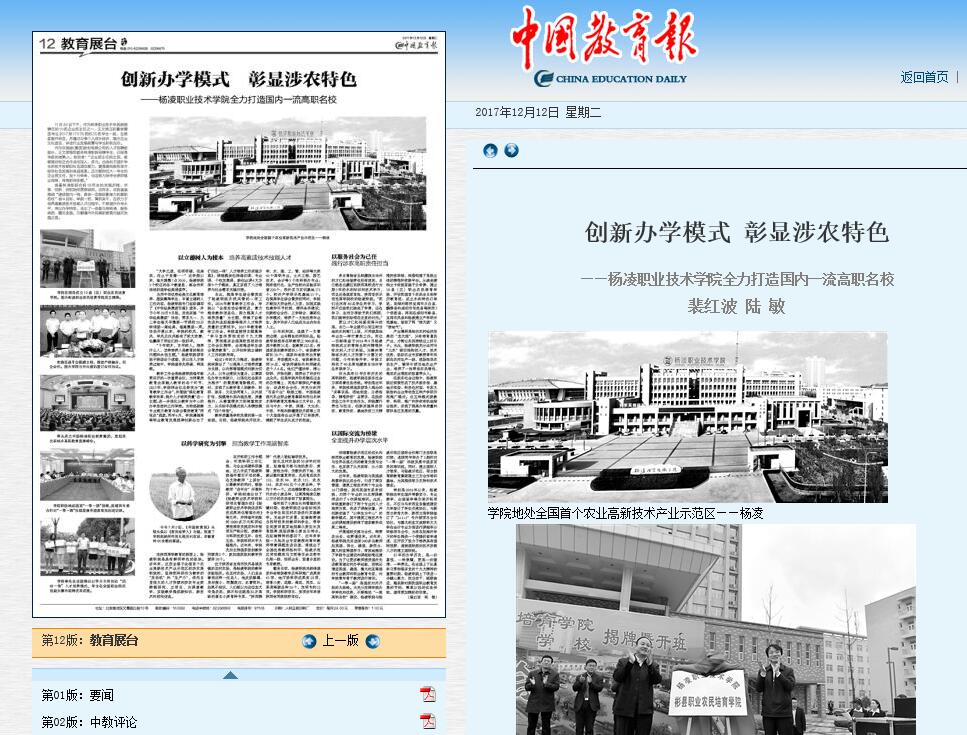 12月12日,【中国教育报】以“创新办学模式 彰显涉农特色——杨凌职业技术学院全力打造国内一流高职名校”为题整版报道了我院做法(详情进入)