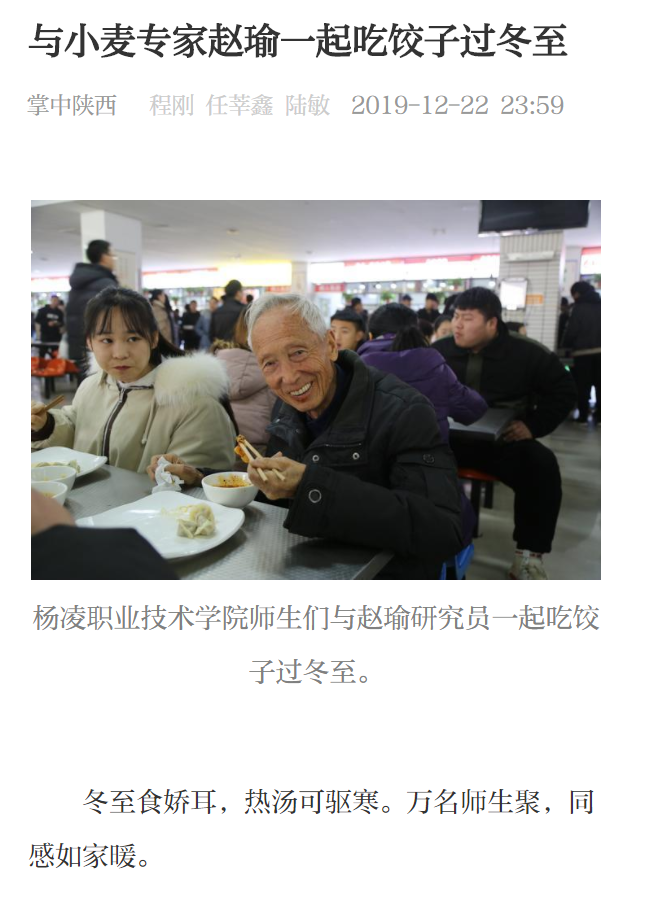 12月22日,杨凌职业技术学院南、西、北三个校区的餐厅里人头攒动、饺香四溢。这里,正举行着一场“品赵瑜面粉饺子 担强农兴农使命”万名师生冬至包饺子活动。全国著名小麦育种专家、杨凌职业技术学院研究员赵瑜来到餐厅,与师生们一起吃饺子、话冬至,聊学习、谈生活。