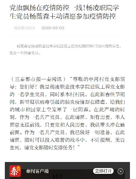 【三秦都市报】党旗飘扬在疫情防控一线!杨凌职院学生党员杨薇森主动请愿参加疫情防控