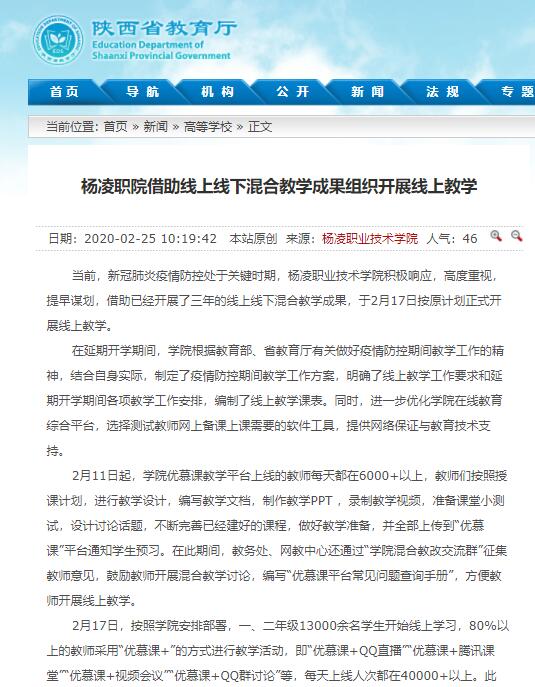 【陕西省教育厅】杨凌职院借助线上线下混合教学成果组织开展线上教学