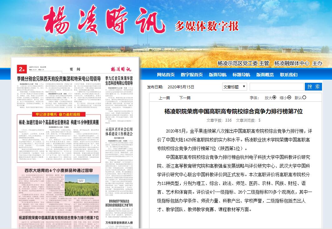 2020年5月,金平果连续第八次推出中国高职高专院校综合竞争力排行榜,评价了中国大陆1429所高职院校的实力和水平。杨凌职业技术学院荣膺中国高职高专院校综合竞争力排行榜第7位(陕西第1位)。 中国高职高专院校综合竞争力排行榜由杭州电子科技大学中国科教评价研究院、浙江高等教育研究院和高教强省发展战略与评价研究中心、武汉大学中国科学评价研究中心联合中国科教评价网正式发布。本次高职评价将高职高专院校分为11种类型,分别为理工、综合、政法、师范、医药、农林、民族、财经、语言、艺术和体育类。评价设4个一级指标、26个二级指标和70多个观测点,其中一级指标包括办学条件、师资力量、科教产出、学校声誉,二级指标包括杰出人才、教学团队、教师教学竞赛、课程教材等方面。