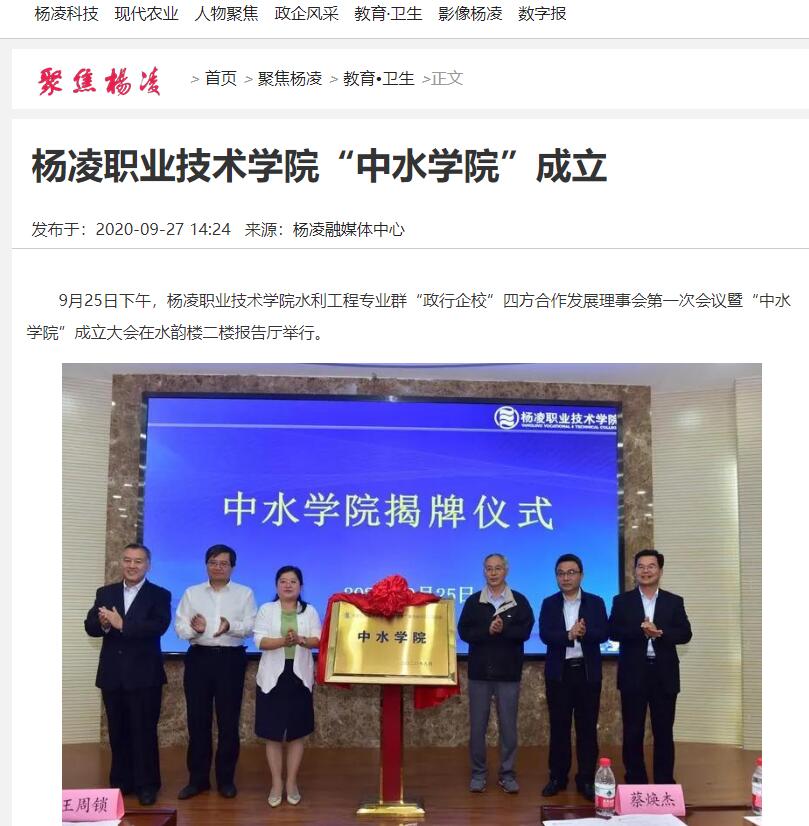 9月25日下午,杨凌职业技术学院水利工程专业群“政行企校”四方合作发展理事会第一次会议暨“中水学院”成立大会在水韵楼二楼报告厅举行。