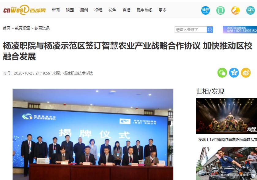 杨凌农高会期间,杨凌职业技术学院与杨凌示范区管委会签订智慧农业产业战略合作协议。杨凌示范区党工委书记李婧,党工委副书记、管委会常务副主任李九红,党工委委员、管委会副主任袁鸿马,杨凌职业技术学院党委书记陈宁、校长王周锁、副校长祝战斌等参加签约仪式。