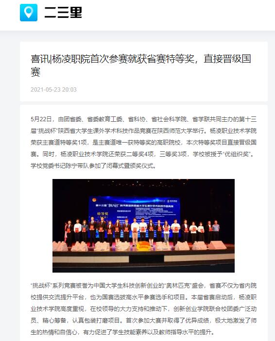5月22日,由团省委、省委教育工委、省科协、省社会科学院、省学联共同主办的第十三届“挑战杯”陕西省大学生课外学术科技作品竞赛在陕西师范大学举行。杨凌职业技术学院荣获主赛道特等奖1项,是主赛道唯一获特等奖的高职院校,本次特等奖项目直接晋级国赛。同时,杨凌职业技术学院还荣获二等奖4项,三等奖3项,学校被授予“优组织奖”。学校党委书记陈宁带队参加了闭幕式暨颁奖仪式。