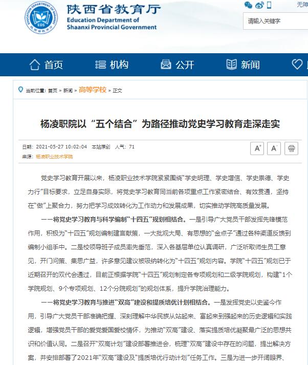 【陕西省教育厅】杨凌职院以“五个结合”为路径推动党史学习教育走深走实