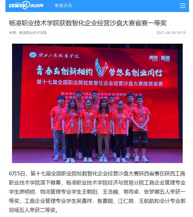 6月5日,第十七届全国职业院校数智化企业经营沙盘大赛陕西省赛在陕西工商职业技术学院落下帷幕,杨凌职业技术学院经济与贸易分院工商企业管理专业学生廖明明、物流管理专业学生王朝阳、王浩楠、常雨卓、张梦娜五人荣获一等奖,工商企业管理专业学生吴嘉祥、焦嘉锟、江仁樊、王航航和会计专业郭培瑶五人荣获二等奖。