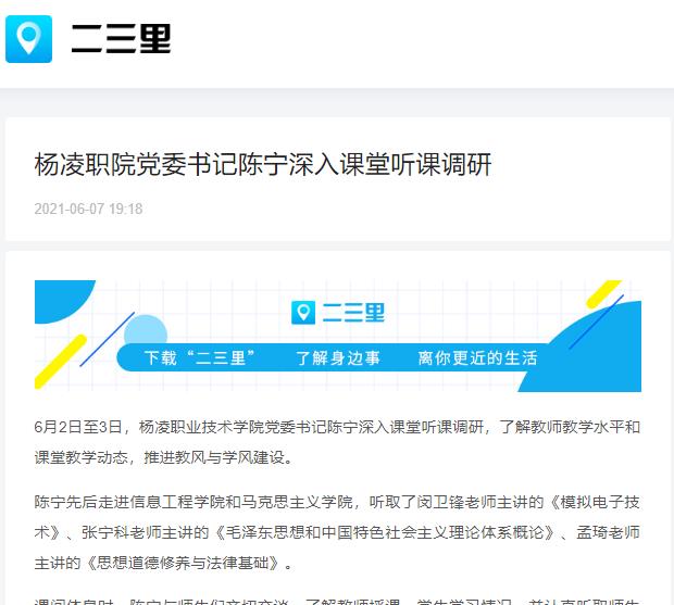 6月2日至3日,杨凌职业技术学院党委书记陈宁深入课堂听课调研,了解教师教学水平和课堂教学动态,推进教风与学风建设。
