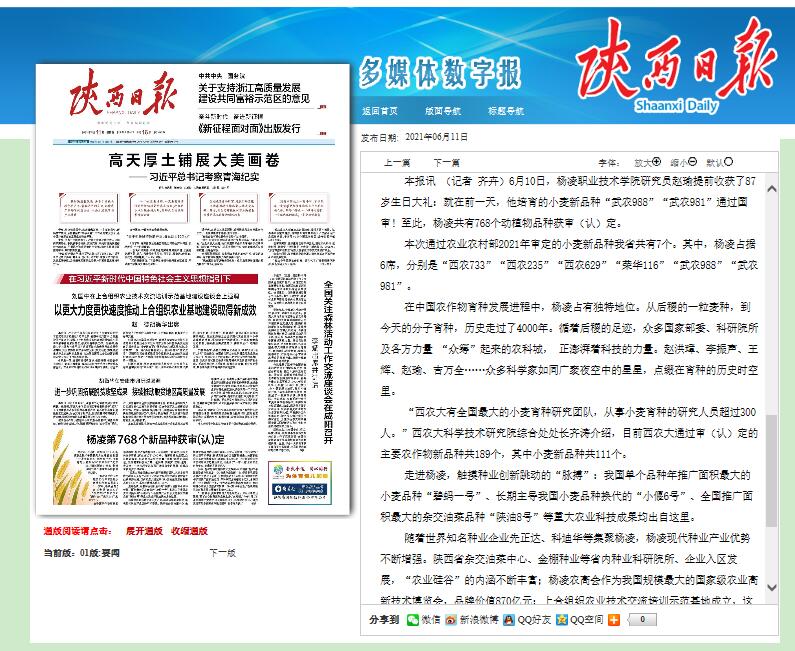 本报讯 (记者 齐卉)6月10日,杨凌职业技术学院研究员赵瑜提前收获了87岁生日大礼:就在前一天,他培育的小麦新品种“武农988”“武农981”通过国审!至此,杨凌共有768个动植物品种获审(认)定。
