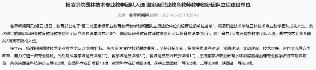 各界新闻网讯(海云)近日,教育部公布了“第二批国家级职业教育教师教学创新团队立项建设单位和培育建设单位名单”,杨凌职业技术学院园林技术专业教学团队成功入选。此次确定的国家级职业教育教师教学创新团队立项建设单位共240个,国家级职业教育教师教学创新团队培育建设单位2个。陕西省共7所高职院校教学团队入选。园林技术专业全国共3所高职院校入选。