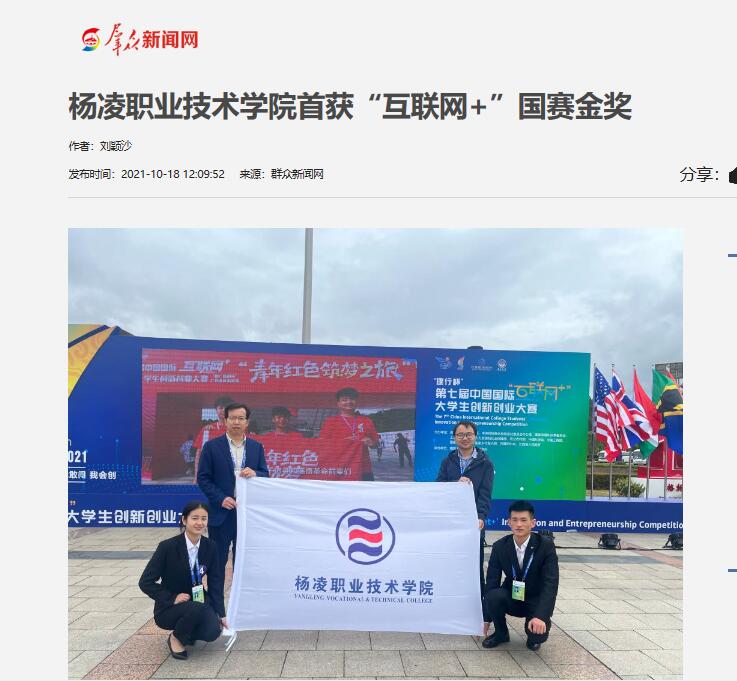 10月14至15日,第七届中国国际“互联网+”大学生创新创业大赛全国总决赛在南昌大学举办,杨凌职业技术学院项目“臭味克星-高效微生物除臭技术专家”获全国总决赛职教赛道创意组金奖,实现了该校在“互联网+”国赛金奖上零的突破。