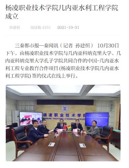 三秦都市报—秦闻讯(记者 孙建恒) 10月30日下午,由杨凌职业技术学院与几内亚科纳克里大学、几内亚科纳克里大学孔子学院共同合作的中国-几内亚水利工程专业教育合作项目(杨凌职业技术学院几内亚水利工程学院)签约仪式在线上举行。