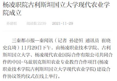 三秦都市报—秦闻讯(记者 孙建恒 通讯员 崔晓 史良琦)11月29日下午,由杨凌职业技术学院、古利斯坦国立大学、杨凌现代农业国际合作有限公司共同合作的中国-乌兹别克斯坦农业专业教育合作项目(杨凌职业技术学院古利斯坦国立大学现代农业学院)建设合作协议签约仪式在线上举行。